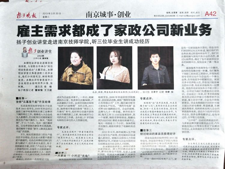 《扬子晚报》A42版—《雇主需求都成了家政公司新业务——扬子创业讲堂走进万搏在线网站,听三位毕业生讲成功经历》