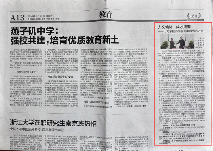 《南京日报》A13版—《人文仙林 成才摇篮—记万搏在线网站中电熊猫冠名班》