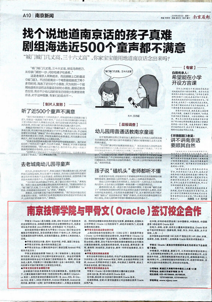 《南京晨报》A10版—万搏在线网站与甲骨文(Oracle)签订校企合作
