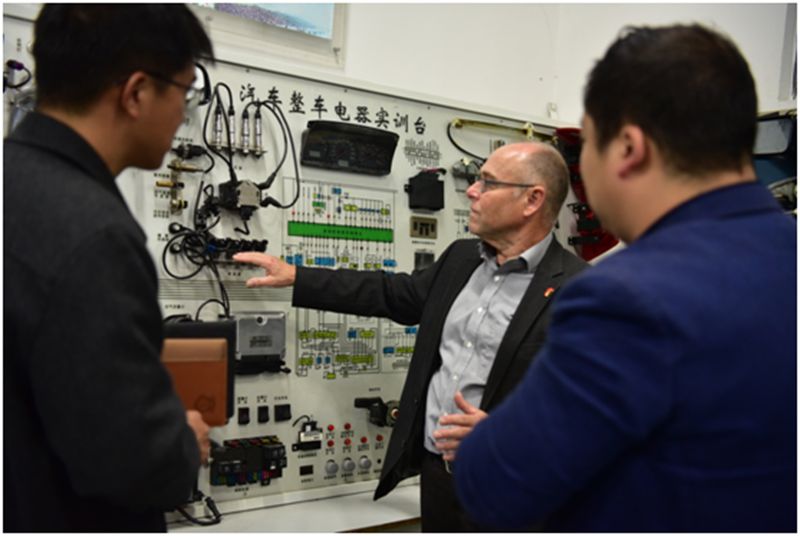 会后Thomas Malcherek先生、Dieter Rehbein先生等参观汽车系实训中心并对实训基地建设提出改进建议,表示在合作班开设准备的过程中,手工业行会将会派专业培训师来我院考察并给出具体的建设方案。