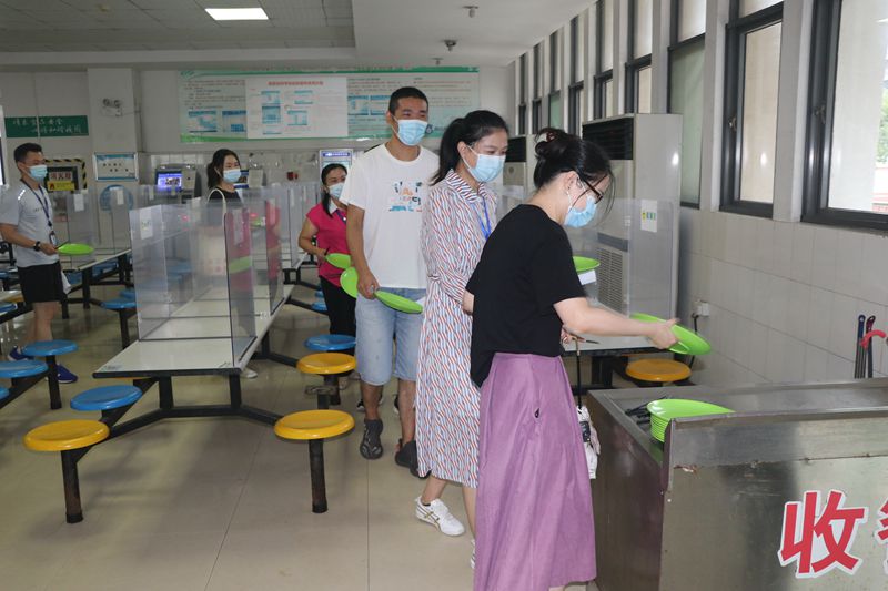 在学生就餐场景演练中,模拟学生进入食堂就餐到用餐结束离开食堂的全过程。分散下课铃声响后,学生陆续进入食堂,他们就餐前先自行洗手,在学生志愿者引导下,间距1米有序进入食堂。进入食堂大厅后按地面指示图标排队至窗口,打餐后到座位间隔就餐,结束用餐后将餐盘放置倒残处回收,从出口有序离开。