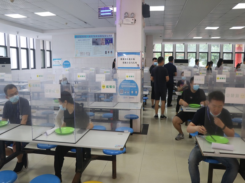 在学生就餐场景演练中,模拟学生进入食堂就餐到用餐结束离开食堂的全过程。分散下课铃声响后,学生陆续进入食堂,他们就餐前先自行洗手,在学生志愿者引导下,间距1米有序进入食堂。进入食堂大厅后按地面指示图标排队至窗口,打餐后到座位间隔就餐,结束用餐后将餐盘放置倒残处回收,从出口有序离开。
