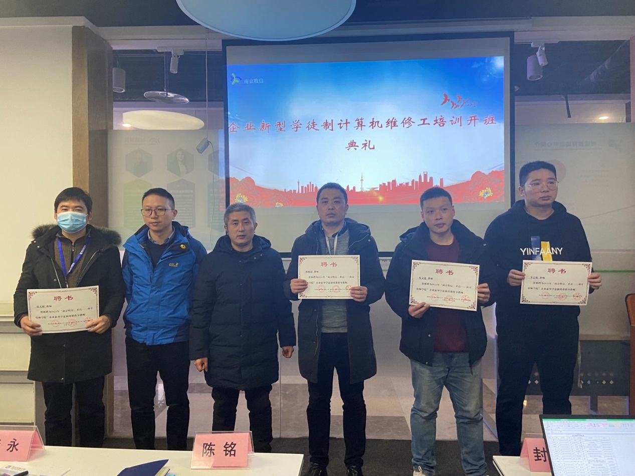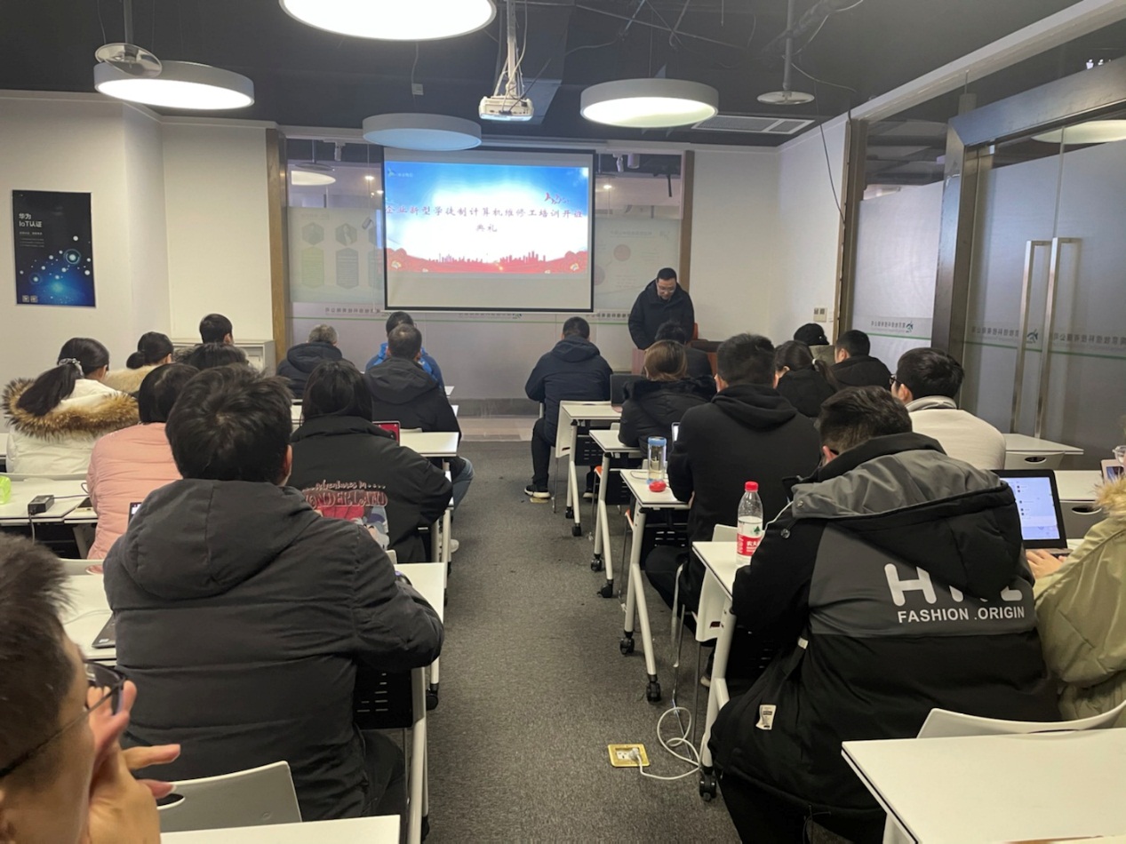 2022年1月11日,万搏在线网站在南京牧信科技有限公司(南京禾达信息有限公司)举行了企业新型学徒制培训班的开班仪式。出席本次开班仪式的有牧信科技副总陆冬昀、经理沈碧英、技师学院招生就业处副主任陈铭、信息技术系副主任李永、教师代表王修喜和班主任蔡敏等。两家企业属关联公司在同层办公,因此开班后将采取合班授课形式,一共40名学员参与培训。