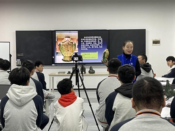 张丽老师通过介绍展示距今8000-5000年的新石器时代陶器、釜灶、彩陶砵、错银铜牛灯等文物照片,深深吸引了现场学生的注意力,学生们在惊叹古人劳动智慧的同时,也被文物“如切如磋,如琢如磨”的工艺细节中折射出的工匠精神深深折服。