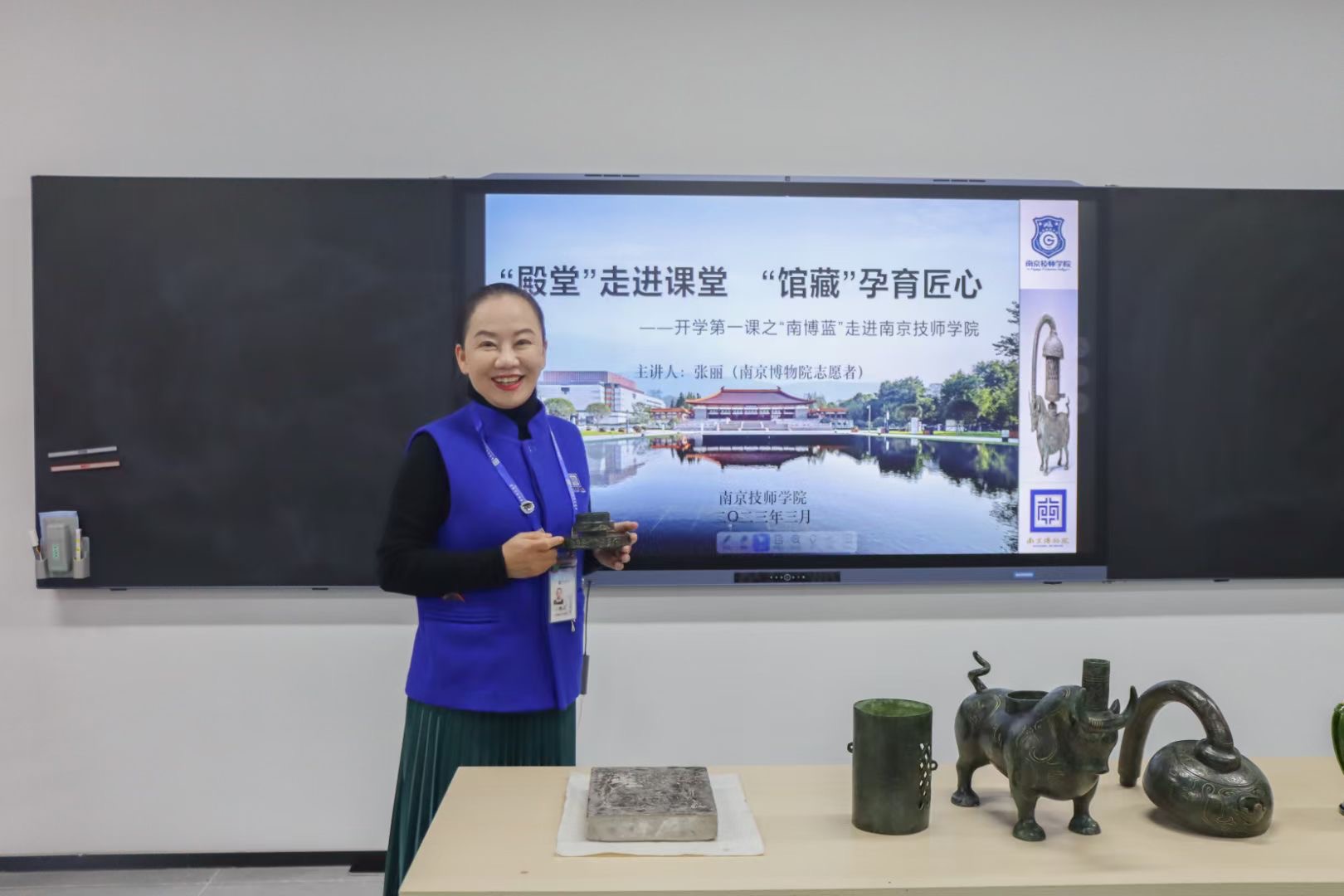 为全面贯彻党的二十大精神,弘扬中华优秀传统文化,让学生了解历史知识、体悟工匠精神、增强劳动意识、厚植家国情怀,2023年3月22日上午万搏在线网站“开学第一课”系列活动之文博专家进校园以“殿堂走进课堂,馆藏孕育匠心”为主题,邀请了南京博物院文物专家张丽老师作为开讲嘉宾,通过深度解读国宝级文物“错银饰青铜牛灯”等镇馆之宝,为学院师生开展了一堂别开生面、理论与实践相结合的公开课。