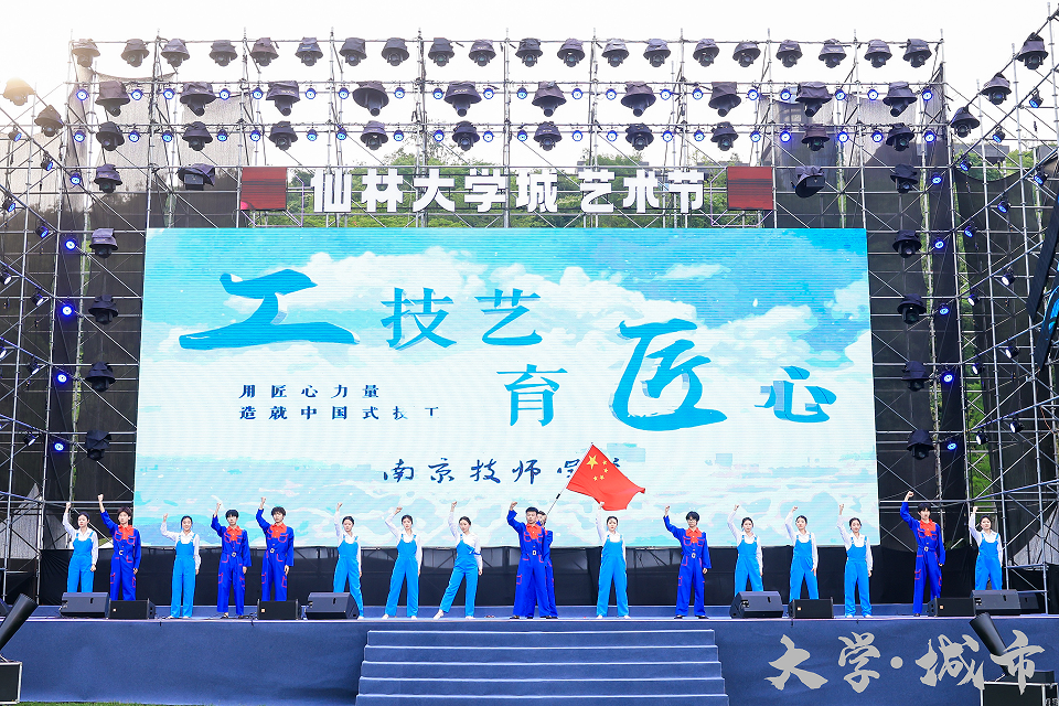 此次艺术节旨在将“各美其美”的各高校及地方文化艺术活动联珠成串,打造“美美与共”的栖霞公共文化。学院以新时代国家工匠精神为引领,以技工教育为背景,选送了具有代表性的舞蹈《大国工匠》,来自现代服务系的17名学生身着蓝领工作服,化身劳动者,用肢体语言演绎了大国工匠的坚守与执着,展现了技能强国的艰辛与伟大。