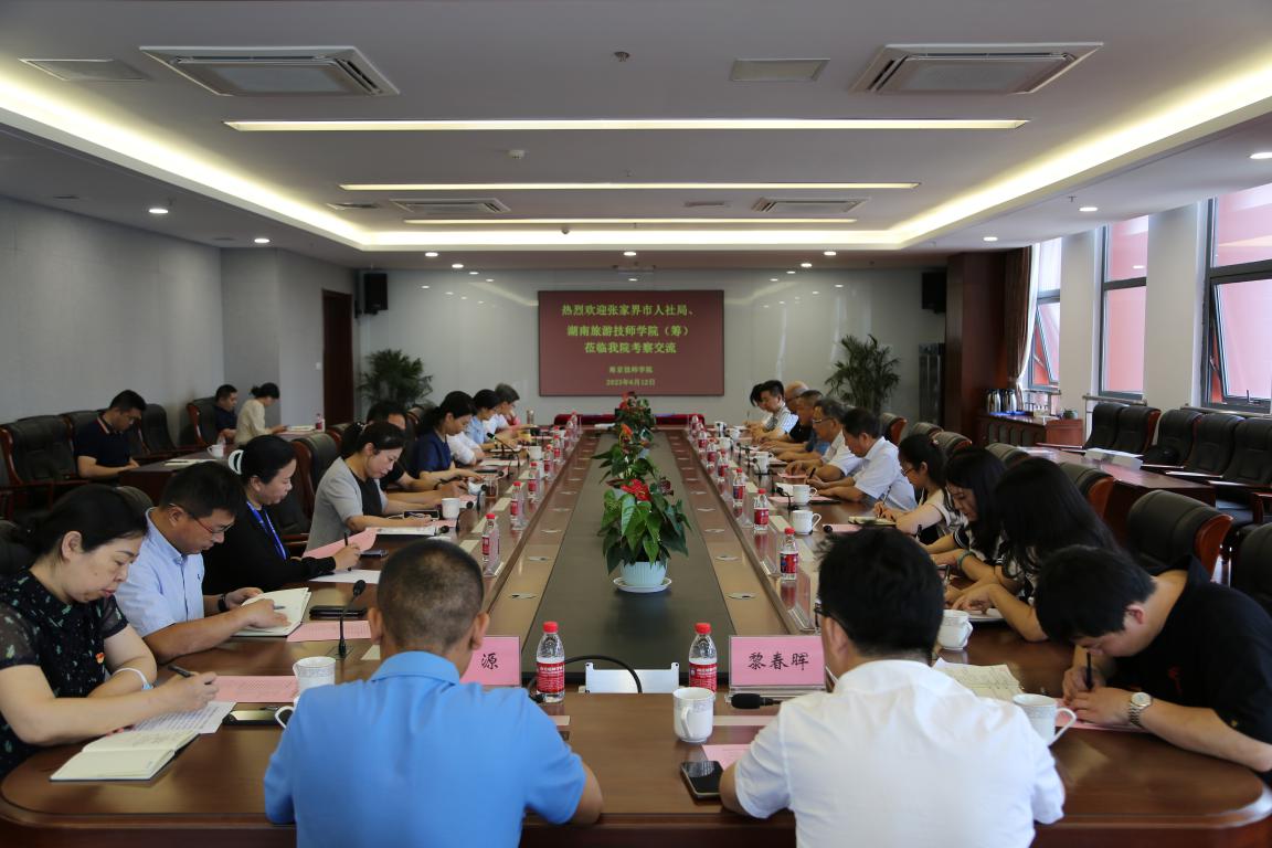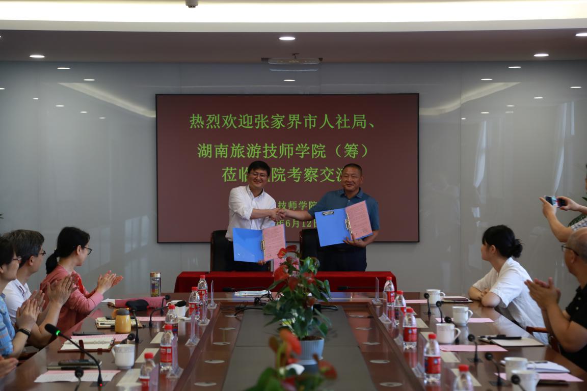 6月12日上午,张家界市人力资源和社会保障局二级调研员刘奇志、湖南旅游技师学院(筹)党委书记欧阳仁德带队来校考察交流,对接对口合作落实措施,并签订校校对口合作协议。万搏在线网站党委书记张金梅、副院长赵杰,湖南旅游技师学院(筹)副校长姚志勇及双方相关人员参加了座谈交流。