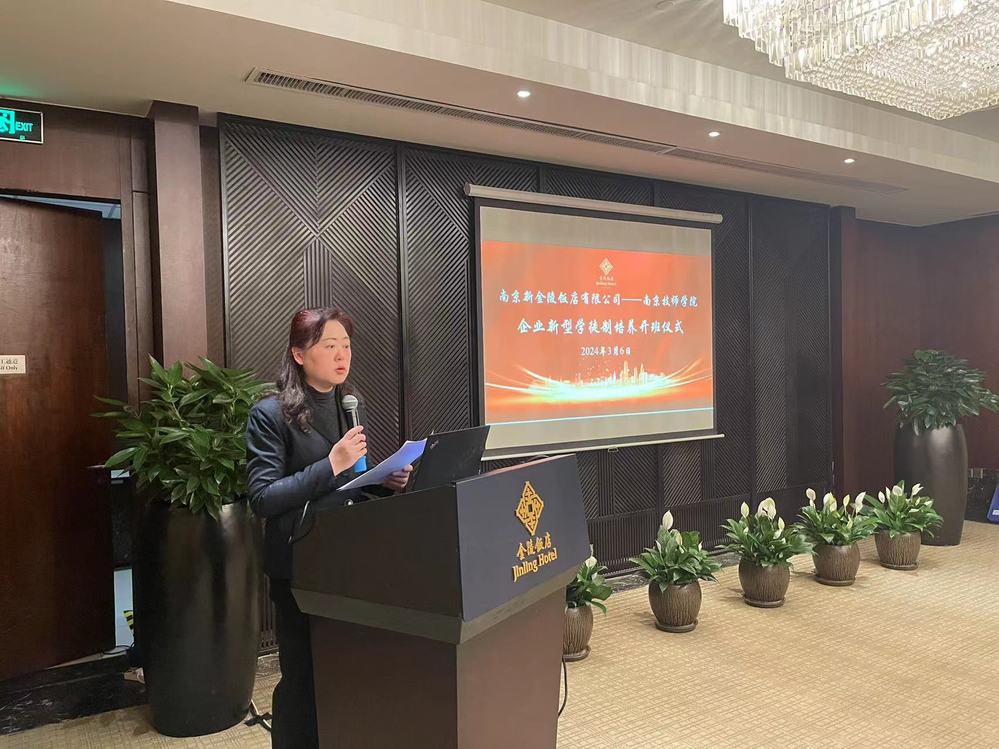 南京市鼓楼区人力资源和社会保障局培训处主管企业新型学徒制项目负责人,南京新金陵饭店有限公司人力资源部总监,餐饮部经理,学院招生就业处主任,现代服务系副主任,企业方人事经理代表,学院班主任,部分企业导师及学员参加了本次开班仪式。